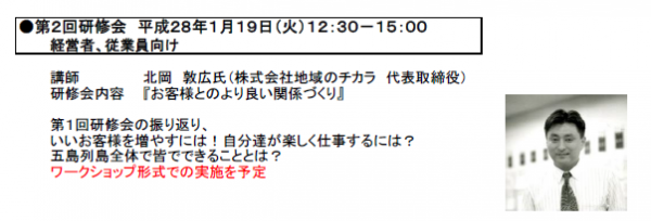 第1回目の「ディズニーに学ぶ 感動を与える人づくり」から始まる"おもてなし"の概念の気づきを提供する内容を皮切りに「観光客から見た五島列島~満足度調査結果の分析~」「宿泊施設の販売戦略」など、実務を学ぶ5回シリーズの研修を実施。